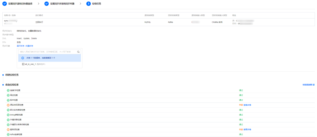 上述配置完成后,DTS 会对源和目标库的各项参数进行预校验,如 Binlog 必须开启,并且 binlog_format 需要设置为 row 模式等等,以保证数据同步结果的正确性。