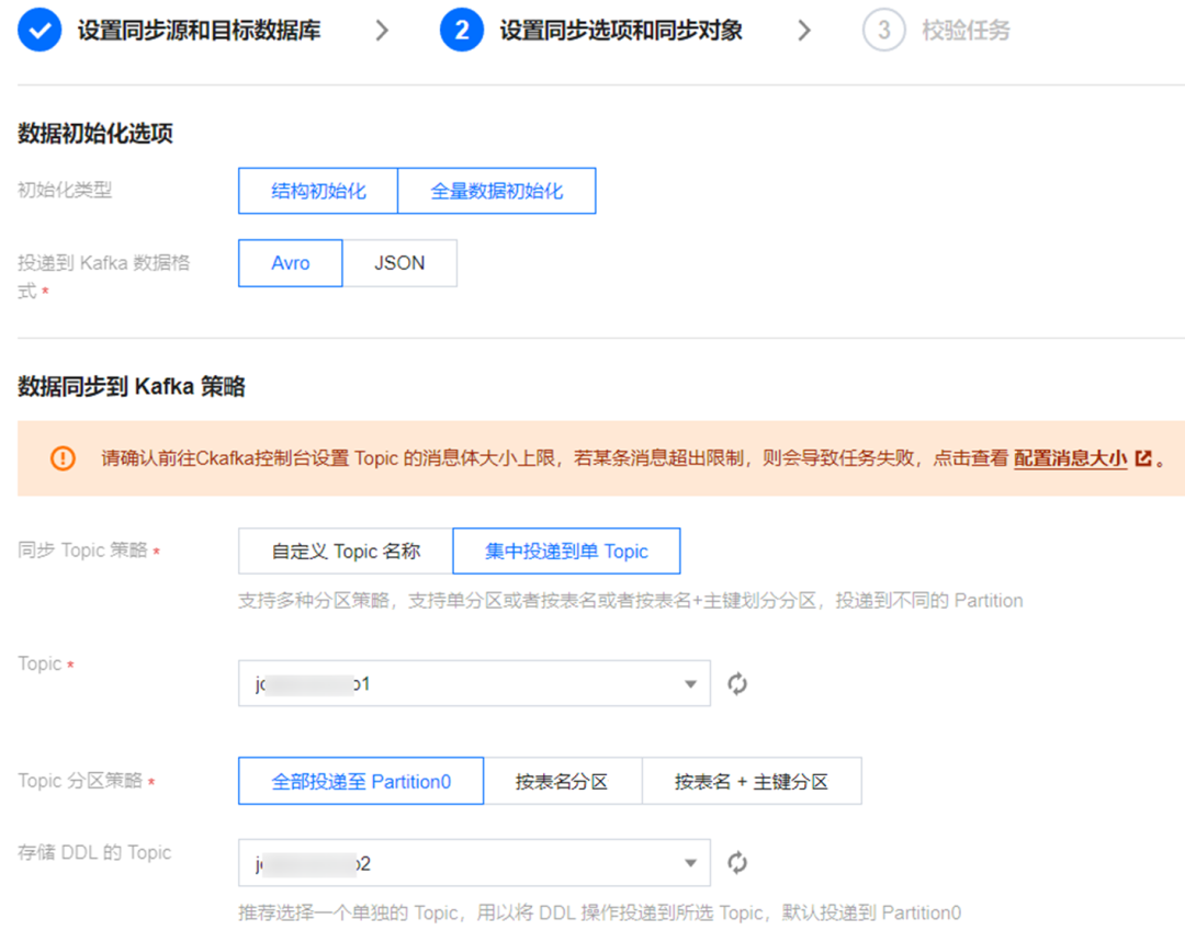 这个步骤主要是选择同步的数据格式(Avro、JSON)、数据投递到 CKafka 的哪个 Topic 下、分区策略等。