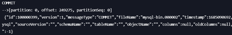 然后运行 ./subscribe --brokers=xxx --topic=xxx --group=xxx --trans2sql=true。这里的 Brokers、Topic、Group 分别填入 CKafka 的地址、消费 Topic 名称、消费组名称。
