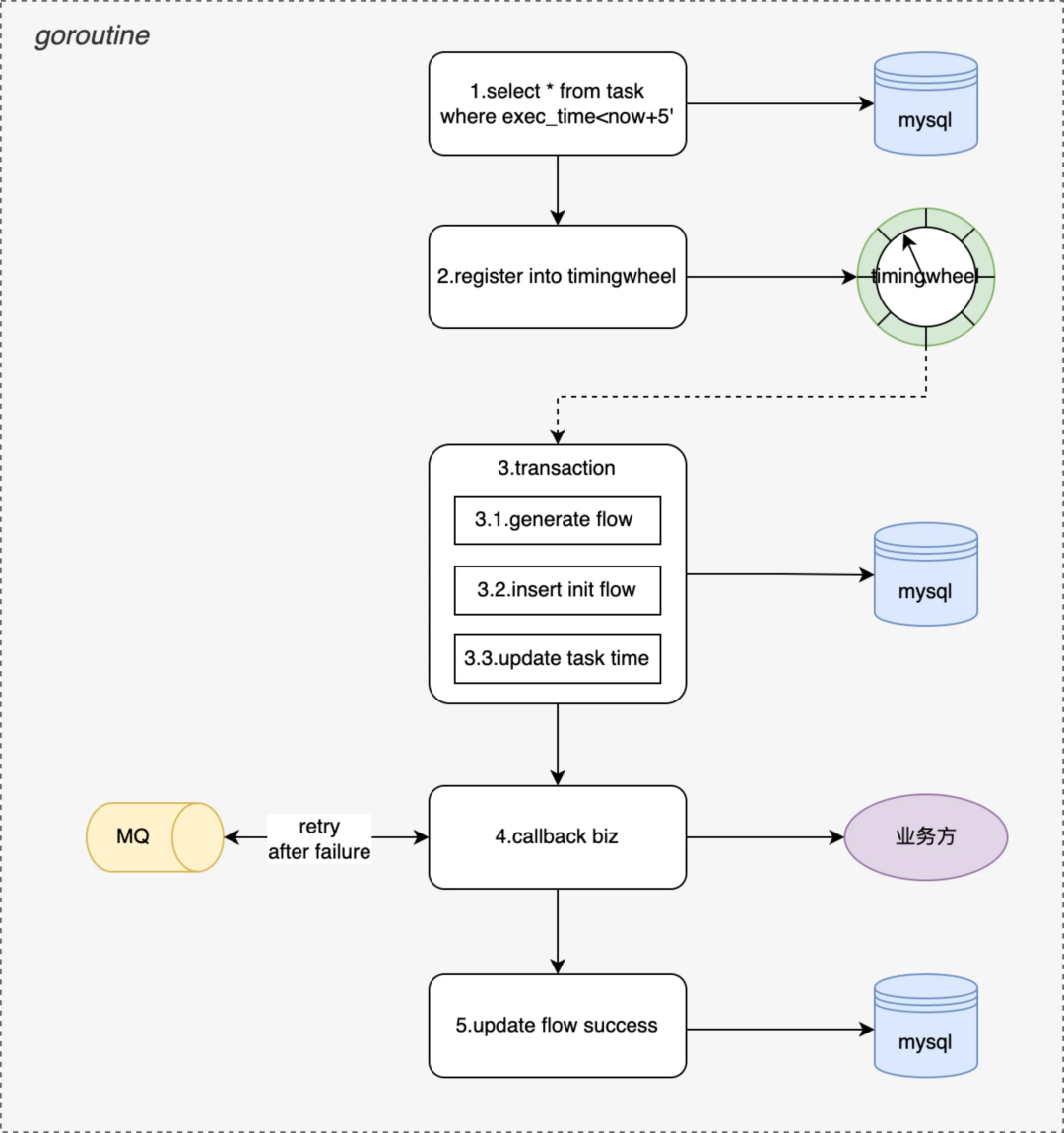 ● 待执行:tjobs 会每隔 5min 执行一次,捞取未来 5min 内所有待执行的任务,注册到一个内存 TimingWheels.中,由 timewheel 通过 callBackFunc 实现定时回调从而实现毫秒级延迟触发业务回调;