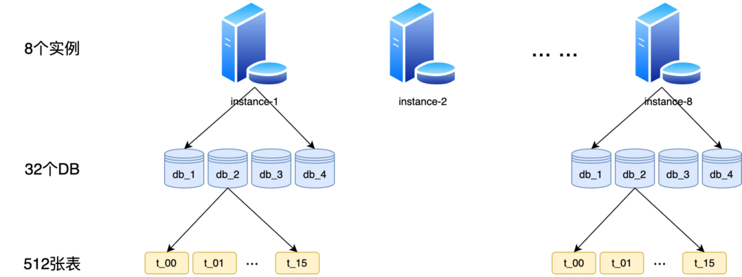 如下图所示,我们生产环境部署了 8 个 DB 实例,每个实例上部署了 4 个逻辑库(目前先通过合并部署减少成本,未来如有更高 TPS 诉求每个逻辑库单独部署即可),每个逻辑库中拆分成 16 个表(拆分多表的目的是保障百亿级任务存储时单表行数不超过 2000w)以保障索引效率和查询性能。