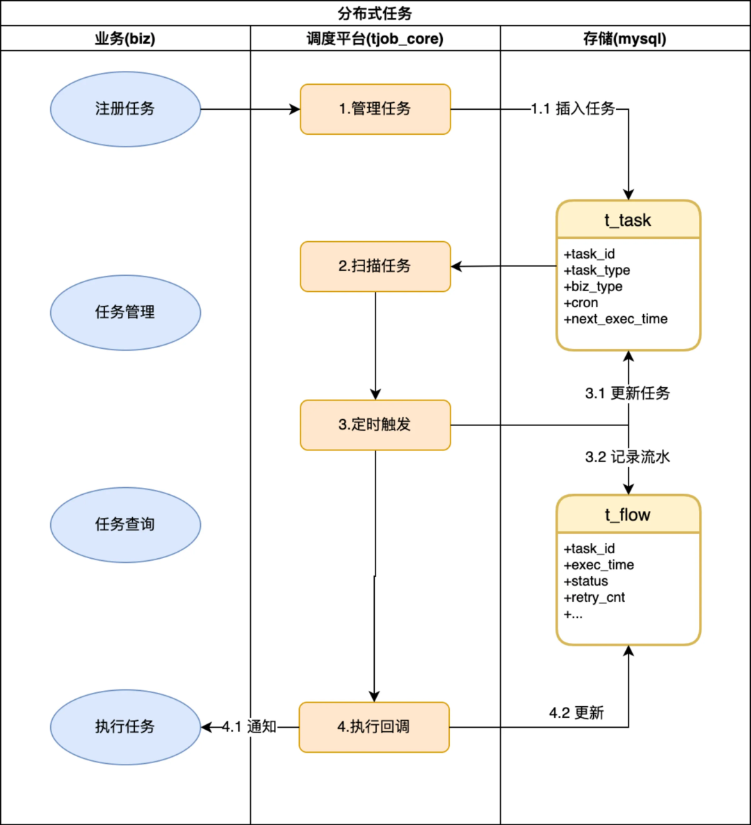 ● 初始化:tjobs 提供任务注册接口,完成任务校验、计算并持久化到 mysql 存储,业务根据实际场景选择 CronCycleTask、IntervalCycleTask、FixedTimeSingleTask、DelayedTimeSingleTask 等不同任务类型提交注册即可;