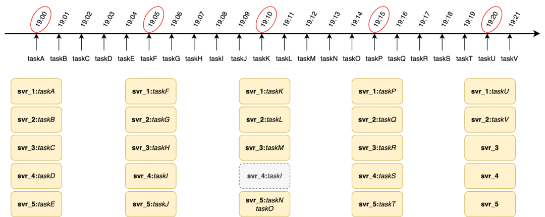 tjobs 的跑批任务的 timeline 原理如下图所示,假设 tjobs 按照 cron(0 0/5 * * ?)执行,在 19:00 时发起调度会拉取 taskA-taskE 任务平均分配给当前可运行的 svr1-svr5 机器上,19.05 以此类推,当 19.10 调度时 svr4 宕机,这会将 taskN 任务和 taskO 任务分配到 svr5 上完成对 svr_4 的容灾。