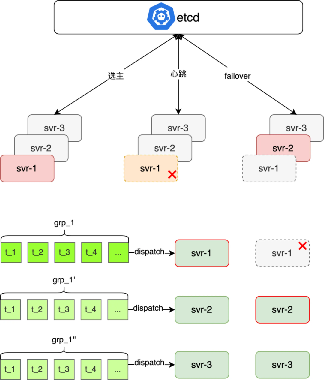 综合上述分析看,要提升保障平台整体的 P99(延迟)、和 99.95%的可用性 SLA,最优方案是“基于调度平台+应用服务器主备 failover”,具体的实现思路(如下图所示),每个周期内待调度的 jobGroup 分被分配到三个不同应用 svr 上,应用层一主两备的部署运行时,然后三个应用 svr 链接 etcd,利用 etcd 的选主和自动 failover 能力,既保障了任务运行的 only once 又能保障单机故障时该机上待执行任务的准时触发