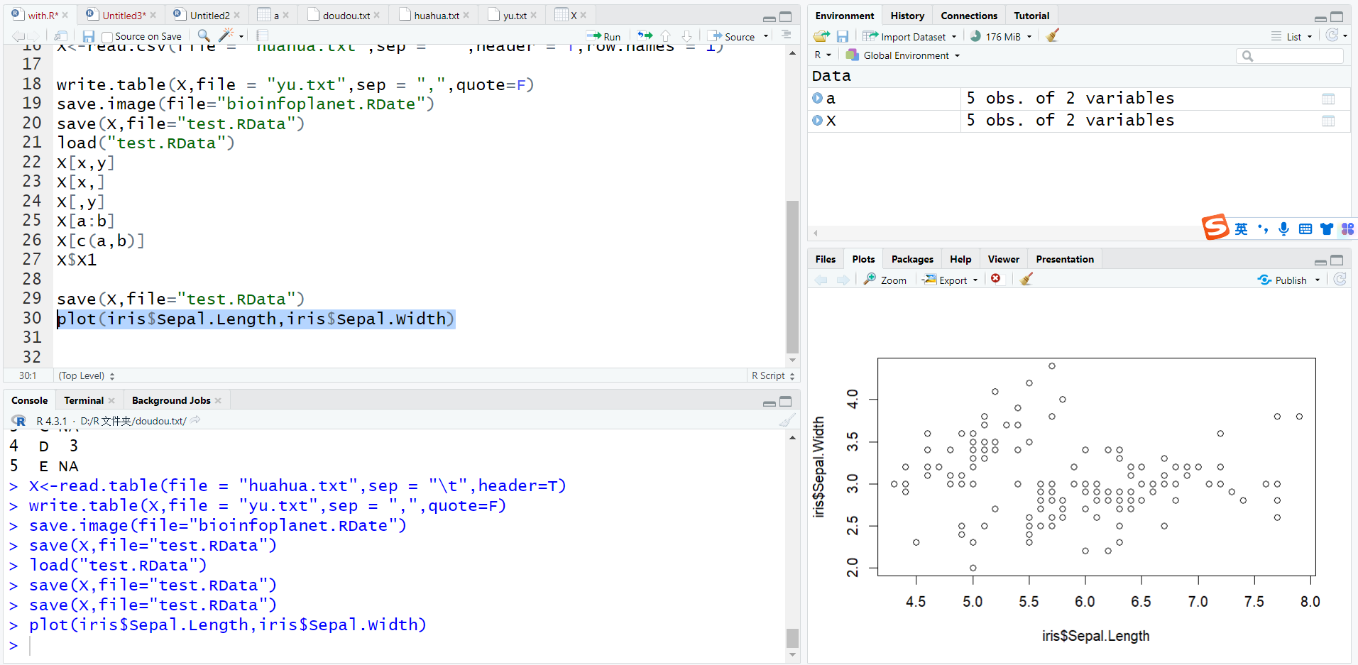 X<-read.csv(file = "huahua.txt",sep = " ",header = T,row.names = 1)3.数据框的导出
