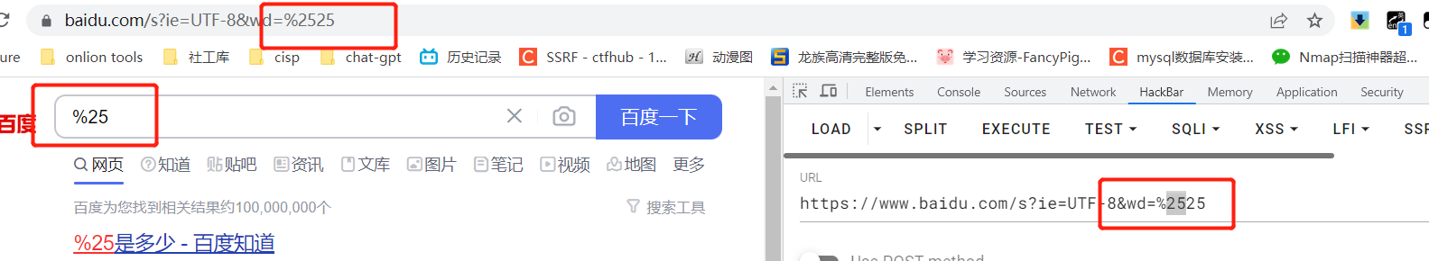 实际想搜索的是%25,url编码后是%2525,如果使用hackbar工具发送请求且不对%编码(即删掉一个25),就会变成搜索%,而不是%25。