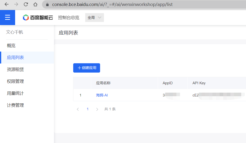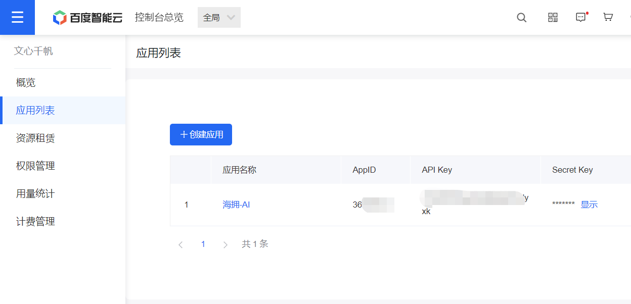 首先,我们需要在控制台中创建应用,这里我在一开始就创建了一个名为”海拥-AI“的应用。创建好应用后,保存AppID、API Key、Secret Key,后面我们需要用到。
