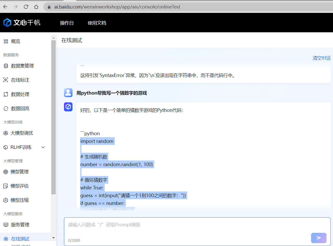 然后来到文心千帆的操作台,先尝试了大模型服务中的"在线测试"。我让它用python帮我写一个猜数字的游戏,响应速度很快。