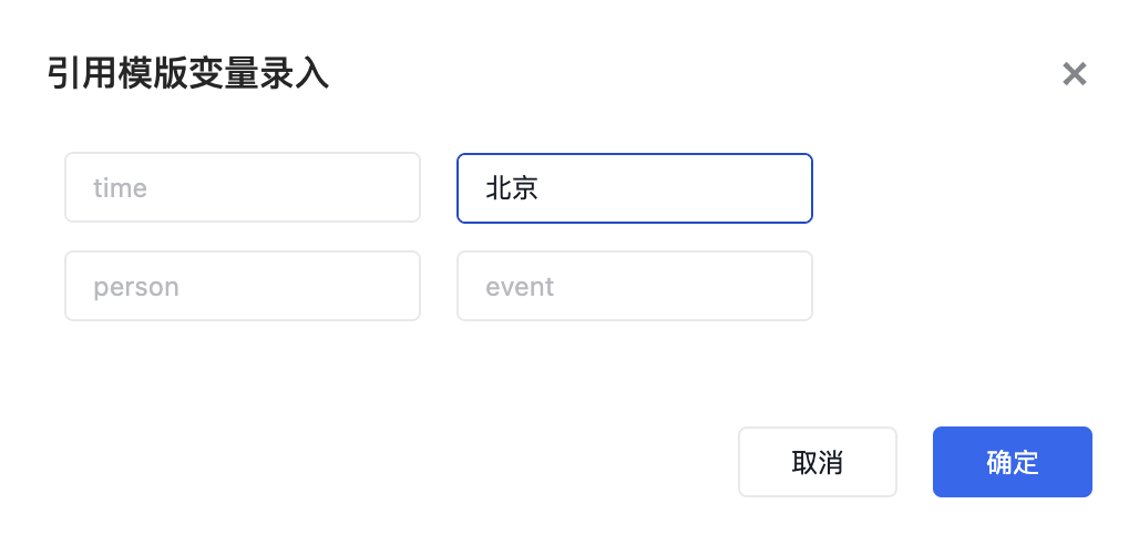 检索需要引用的prompt模板,点击“引用”按钮,对于无变量设置的prompt模板,会直接输入,对于有变量设置的prompt模板需要输入变量才可进行验证,如下图所示: