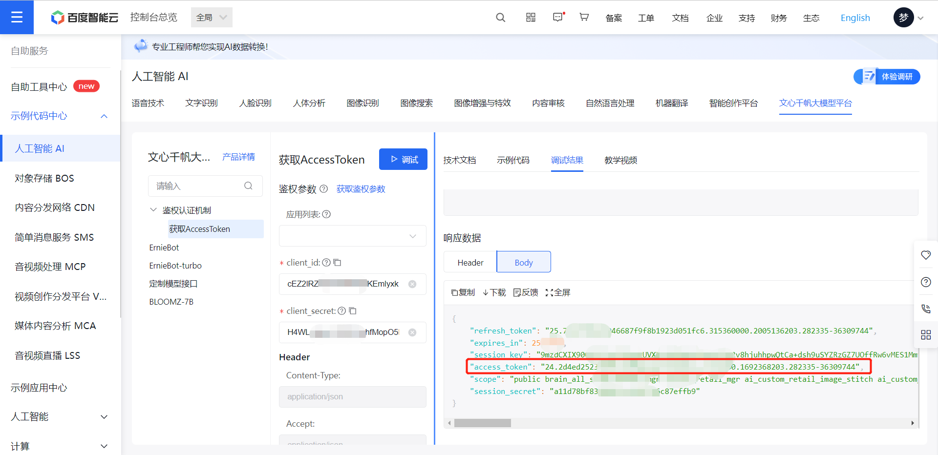 根据第一步中获取的API Key、Secret Key,获取access_token。更多详情方法可参考 鉴权认证机制。或参考以下curl命令向鉴权服务器请求access_token。
