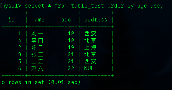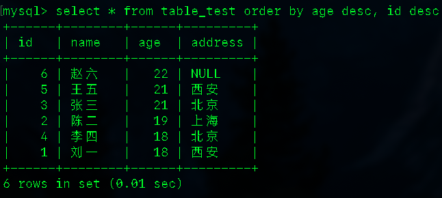 3.3 table_test 表中数据按照年龄降序排列,年龄一样的,在继续按照id降序排列