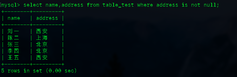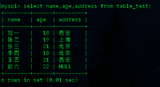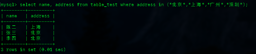 6、查询地址在列表["北京","上海","广州","深圳"]中的人的姓名和地址