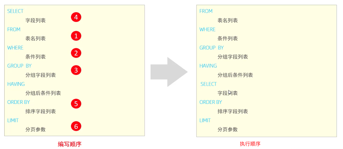 select 字段列表 from 表名列表 where 条件列表 group by 分组字段列表 having 分组后条件列表 order by 排序字段列表 limit 分页参数