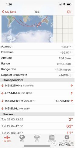 软硬件准备完毕,现在开始确认时间 通过 ISS 官方渠道,确认国际空间站无线电模块发射时间,根据自己所在地时区进行转换。根据卫星跟踪软件,确认上述发射时间内,卫星过境时间及仰角,尽可能选择大仰角时间进行信号接收(大仰角可尽可能避免高楼阻挡,如下图 63° 时的4点47分是一个比较好的接收时间)。