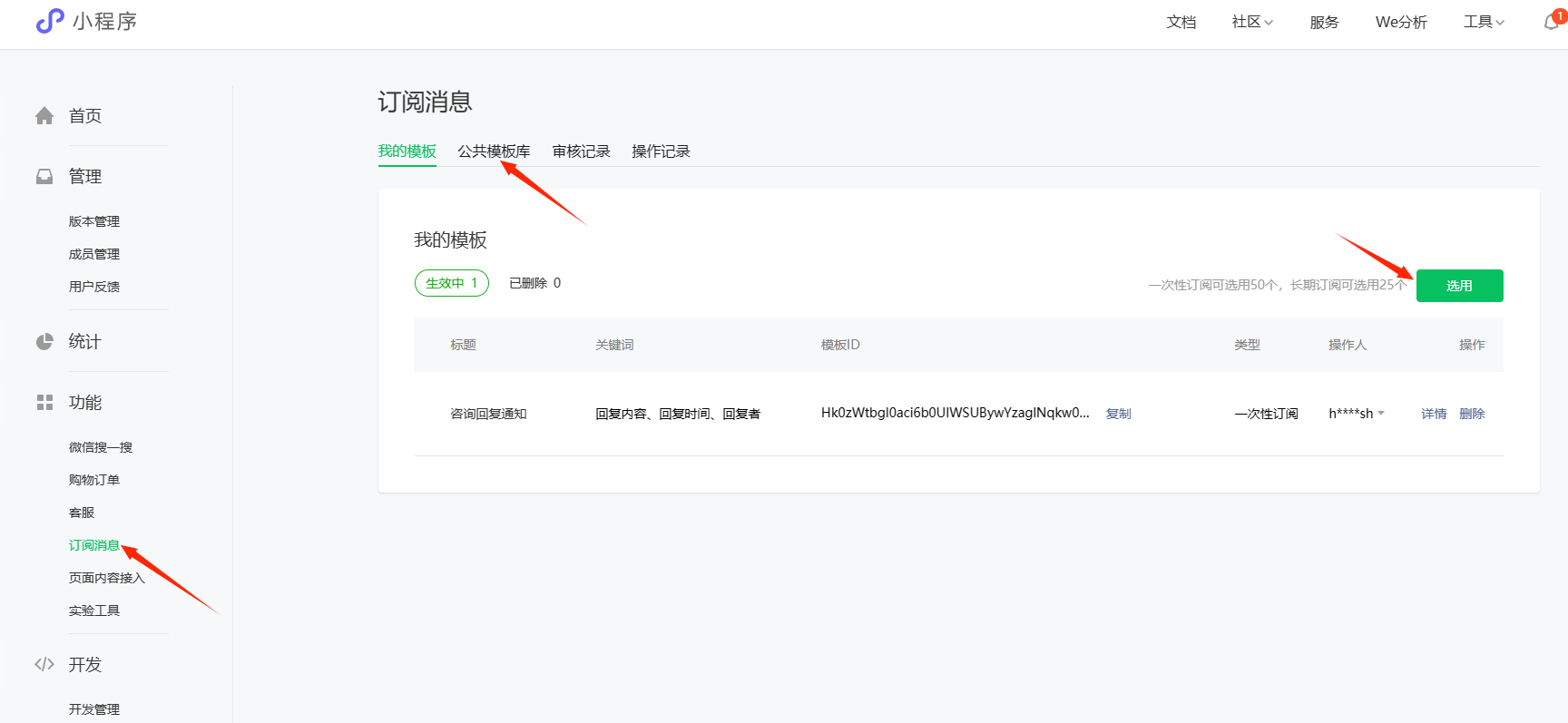 我们前往小程序后台,去开启一下订阅消息,并且选用一个模板。