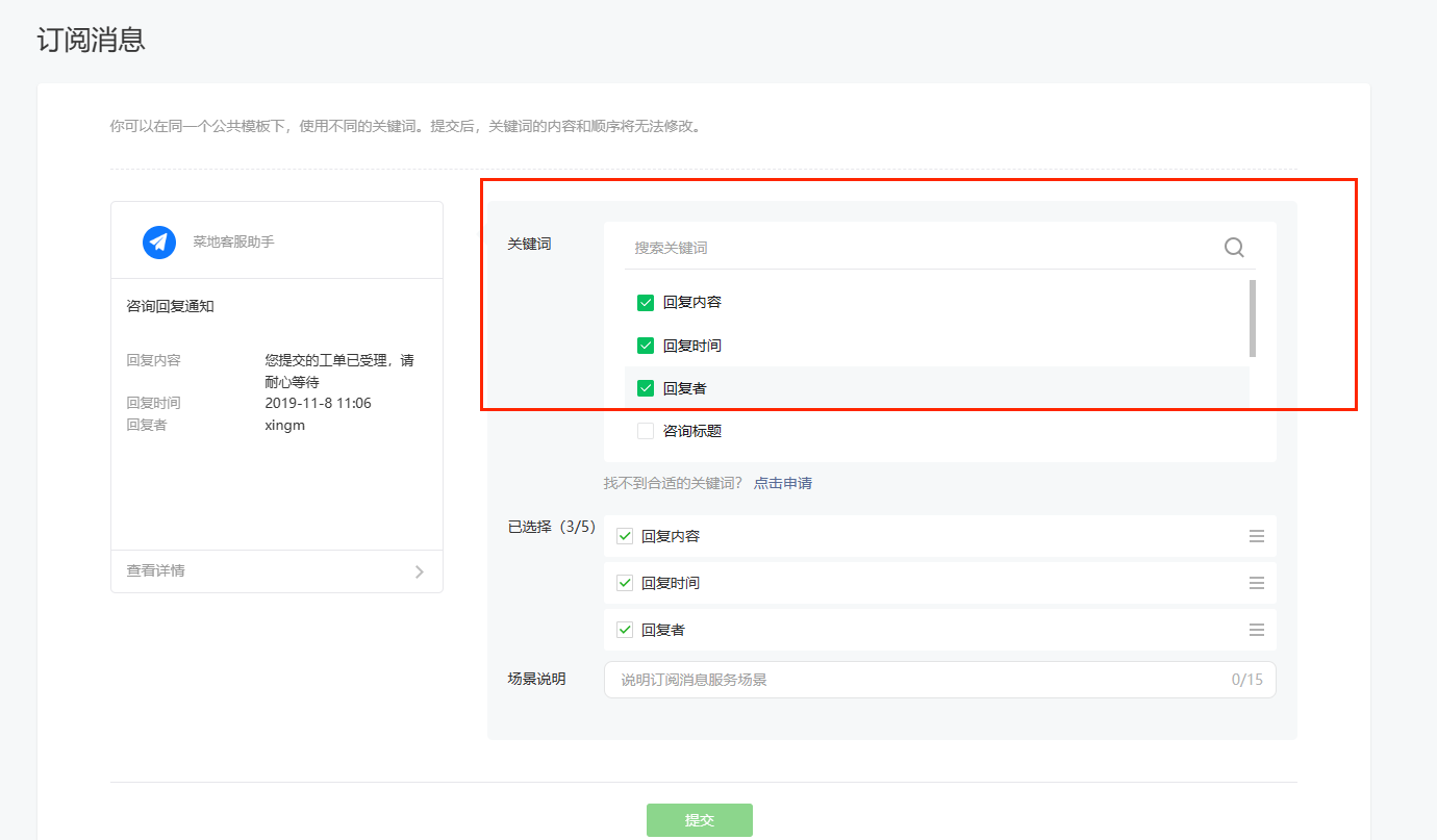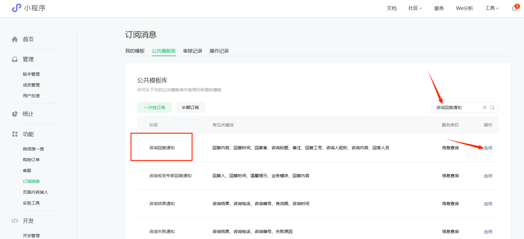在公共模板库里搜索一下,选用“咨询回复通知”