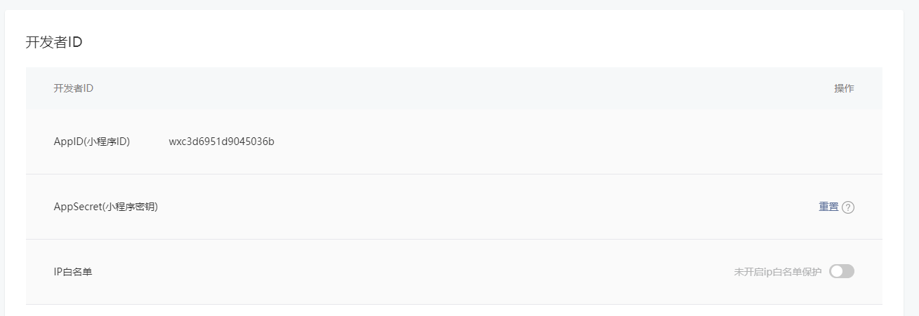 再往上翻,开发者ID部分,把AppID AppSecret 找个文档记下来,ip白名单我先给关上了