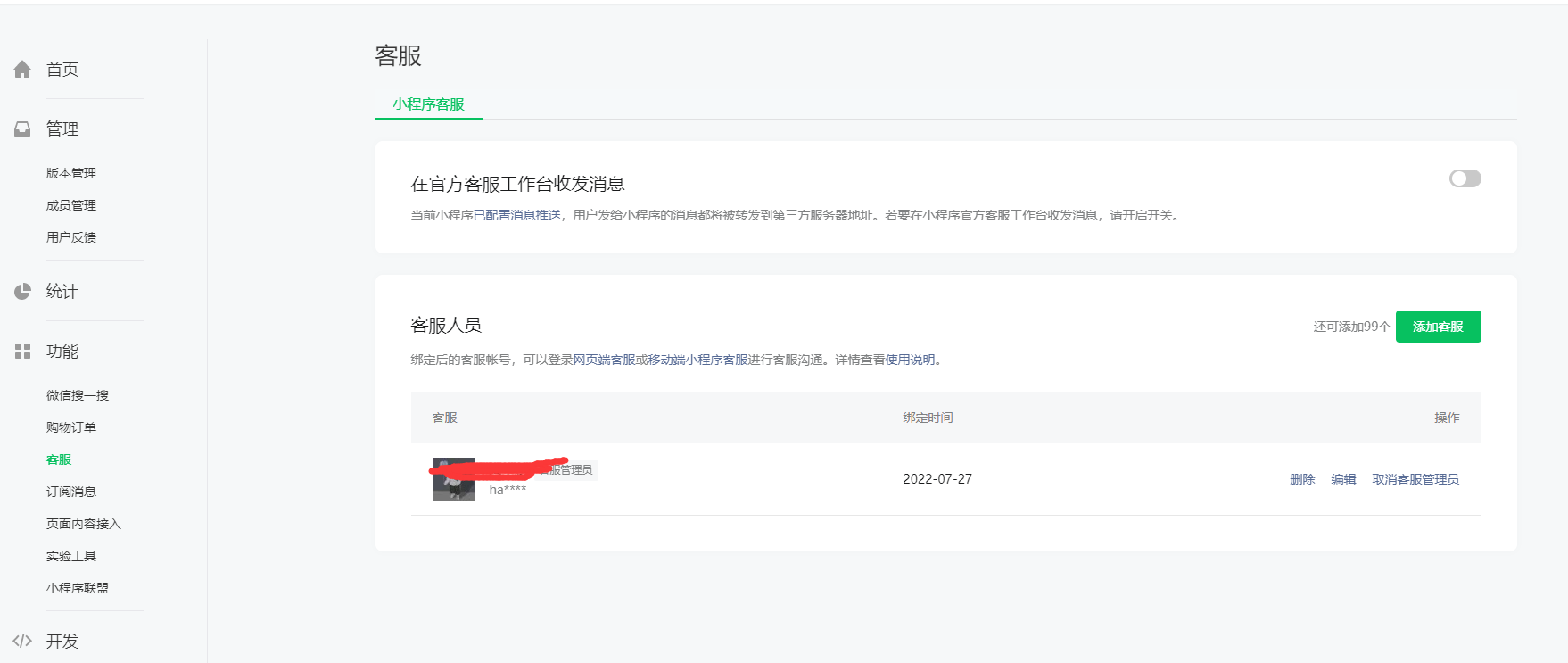 功能==>客服==>小程序客服,配置好自己的客服人员