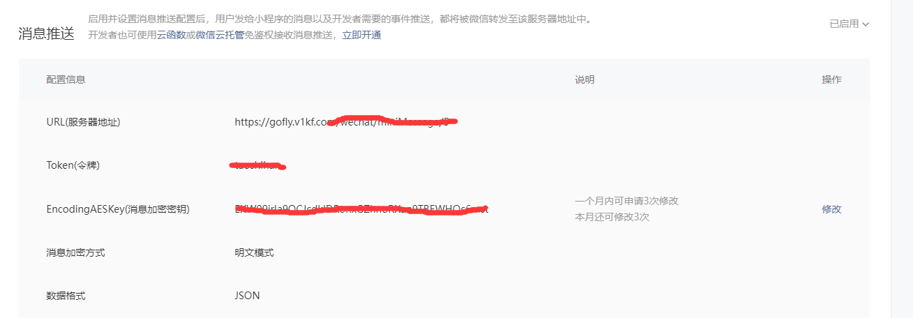 在小程序后台==>开发管理==>开发设置==>消息推送中补全信息,这个时候如果提交会报token校验失败,需要回到客服系统去配置相应的信息