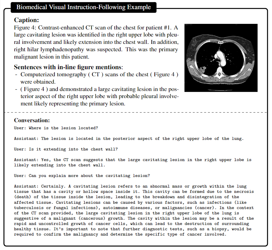 然而,虽然在通用领域取得了成功,但是这样的LMMs在生物医学领域的效果较差,因为生物医学图像-文本对与通用网络内容截然不同。 结果是,通用领域的视觉助手可能表现得像一个外行人,不会回答生物医学问题,或者更糟糕的是产生错误的回答或完全的虚构。生物医学视觉问答(VQA)已经取得了很大进展,但以前的方法通常将问题建模为分类(例如,在训练集中观察到的不同答案之间的分类),并且对于开放性指令遵循的任务准备不足。因此,尽管生成式对话AI已经展示了在生物医学应用方面的巨大潜力,但当前的研究通常仅限于单模态文本。