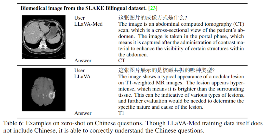 zero-shot中的中文问题示例。尽管LLaVA-Med的训练数据本身不包括中文,但它能够正确理解中文问题。