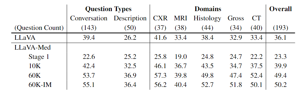 仅进行第一阶段训练的LLaVA-Med作为聊天机器人是不够的,因为它失去了理解多样化指令的能力,尽管在生物医学概念覆盖方面有所改进。经过完整的两阶段训练的LLaVA-Med持续优于一般领域的LLaVA,并且使用更大的指导数据(从10K到60K样本)会导致更高的性能。当在自我指导中考虑内联提及时,生成的数据60K-IM稍微提高了聊天能力。结果证明了生物医学指令跟随数据收集策略的有效性以及数据集的价值。总体而言,对于最佳的LLaVA-Med,它与GPT-4的50.2%性能相匹配。需要注意的是,GPT-4通过考虑真实标题和黄金内联提及来生成回答,而不理解图像。尽管LMM(大型多模态模型)和GPT-4之间不是公平的比较,但GPT-4是一个一致可靠的评估工具