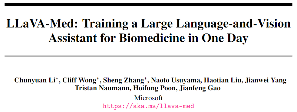 Title: LLaVA-Med: Training a Large Language-and-Vision Assistant for Biomedicine in One Day PDF: https://arxiv.org/pdf/2306.00890v1.pdf Code: https://aka.ms/llava-med