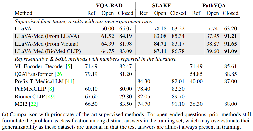 与先前的最先进监督方法的比较。对于开放式问题,先前的方法仍然将问题表述为在训练集中的不同答案之间的分类,这可能会高估它们的泛化能力,因为这些数据集的特殊之处在于测试答案几乎总是出现在训练中。加粗表示LLaVA-Med达到了新的最优结果。