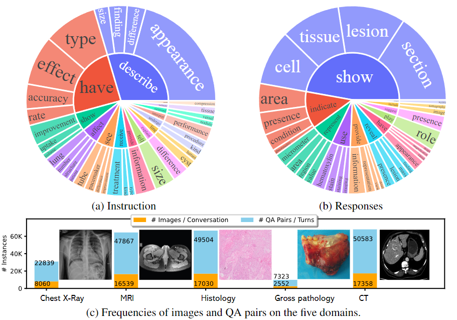 生物医学多模态指令遵循数据的数据统计:(a,b) 指令和回复的根动词-名词对,图中的内圈表示输出回复的根动词,外圈表示直接名词。(c) 图像和问答对在五个领域上的分布,每个领域展示一张图像。