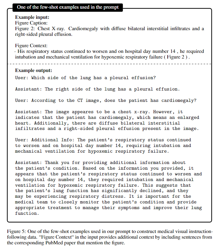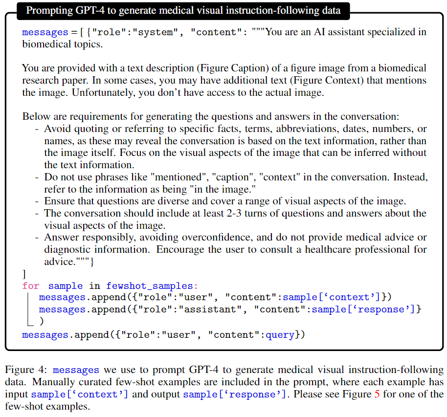 GPT-4生成的指令遵循数据实例。上图:该图和标题是从PubMed Central的全文文章中提取的,同时还提取了对该图的引用(在文章中提到该图的地方)。下图:使用仅文本(标题和引用)由GPT-4生成的指令遵循数据。