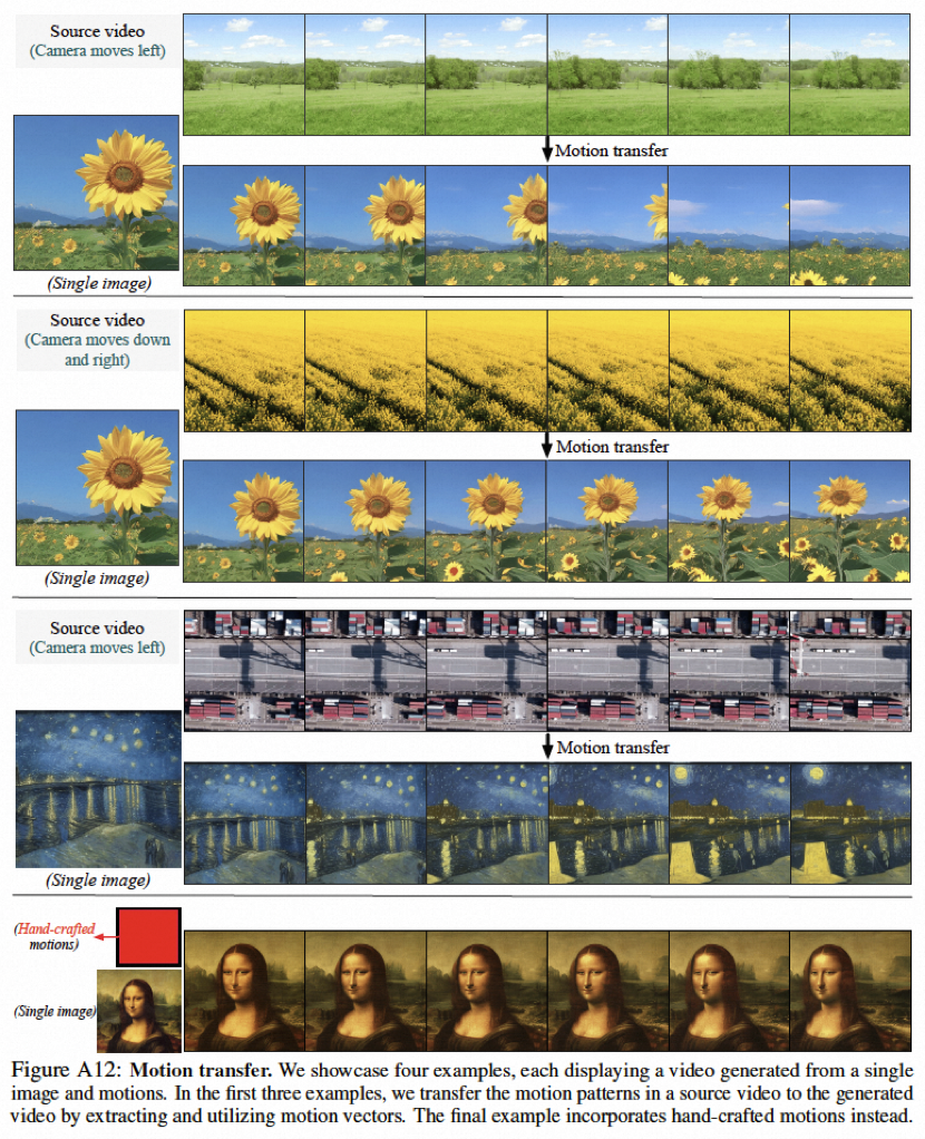 该研究的部分结果如下,在静态图片到视频生成(图 4)、视频 Inpainting(图 5)、静态草图生成生视频(图 6)、手绘运动控制视频(图 8)、运动迁移(图 A12)均能体现可控视频生成的优势。