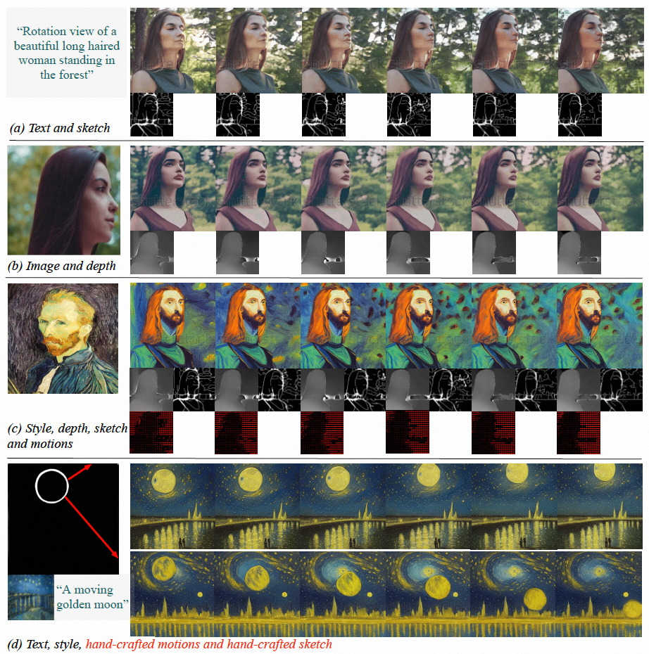 图 (a-c)VideoComposer 能够生成符合文本、空间和时间条件或其子集的视频;(d)VideoComposer 可以仅仅利用两笔画来生成满足梵高风格的视频,同时满足预期运动模式(红色笔画)和形状模式(白色笔画)