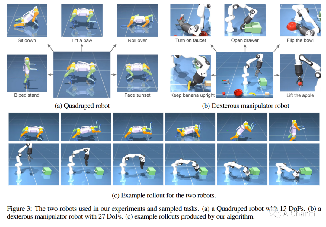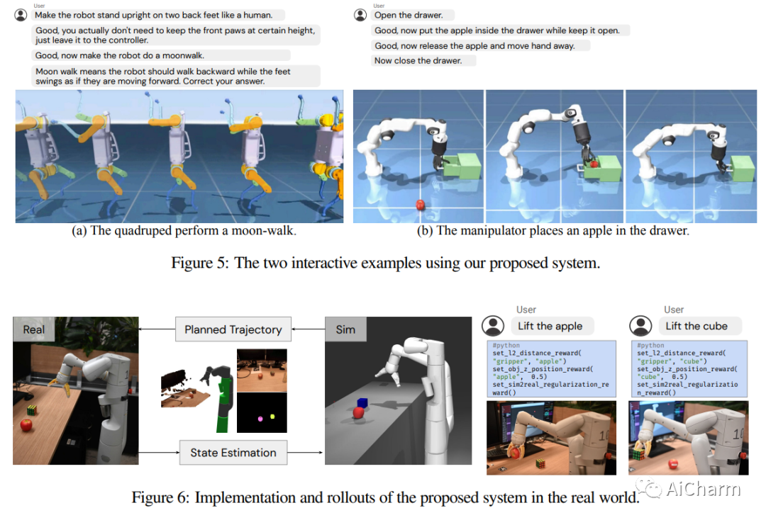 大型语言模型(LLM)在通过上下文学习(从逻辑推理到代码编写)获取各种新能力方面取得了令人兴奋的进展。机器人研究人员还探索了利用法学硕士来提高机器人控制的能力。然而,由于低级机器人动作依赖于硬件,并且在法学硕士培训语料库中代表性不足,因此将法学硕士应用于机器人技术的现有努力在很大程度上将法学硕士视为语义规划器或依赖于人类设计的控制原语与机器人进行交互。另一方面,奖励函数被证明是灵活的表示,可以针对控制策略进行优化以实现不同的任务,而它们的语义丰富性使它们适合由法学硕士指定。在这项工作中,我们引入了一种新的范例,通过利用法学硕士来定义可以优化并完成各种机器人任务的奖励参数,从而利用这种实现。使用奖励作为 LLM 生成的中间接口,我们可以有效地弥合高级语言指令或对低级机器人动作的纠正之间的差距。同时,将其与实时优化器 MuJoCo MPC 相结合,可实现交互式行为创建体验,用户可以立即观察结果并向系统提供反馈。为了系统地评估我们提出的方法的性能,我们为模拟四足机器人和灵巧机械手机器人设计了总共 17 个任务。我们证明,我们提出的方法可以可靠地解决 90% 的设计任务,而使用原始技能作为代码即策略接口的基线可以实现 50% 的任务。我们在真实的机器人手臂上进一步验证了我们的方法,其中复杂的操作技能(例如非抓握式推动)通过我们的交互系统出现。