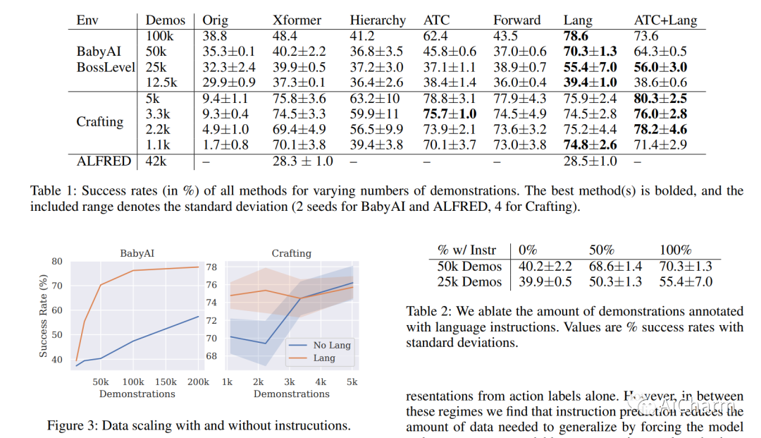 复杂的长期规划及其组合性质给基于学习的智能体带来了严峻的挑战。在低数据情况下,这种设置的困难会加剧,其中过度拟合会抑制泛化,复合错误会损害准确性。在这项工作中,我们探索了一种经常未使用的辅助监督来源的使用:语言。受基于变压器的模型最新进展的启发,我们训练具有指令预测损失的代理,鼓励学习在高抽象级别上运行的时间扩展表示。具体来说,我们证明,在 BabyAI 和 Crafter 基准上进行有限数量的演示训练时,指令建模可以显着提高规划环境中的性能。在进一步的分析中,我们发现指令建模对于需要复杂推理的任务最为重要,而在需要简单计划的环境中提供的收益较小,这是可以理解的。