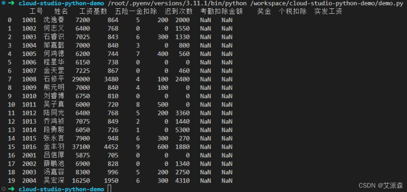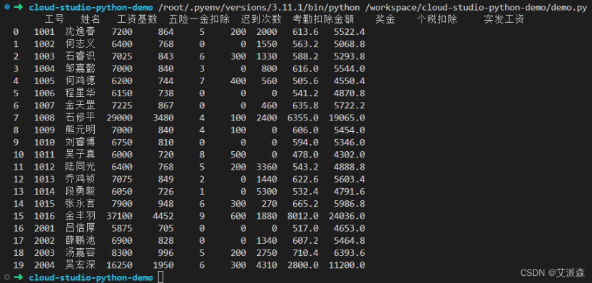 4、新建一个文件将表格中的数据在Cloud Studio终端中输出