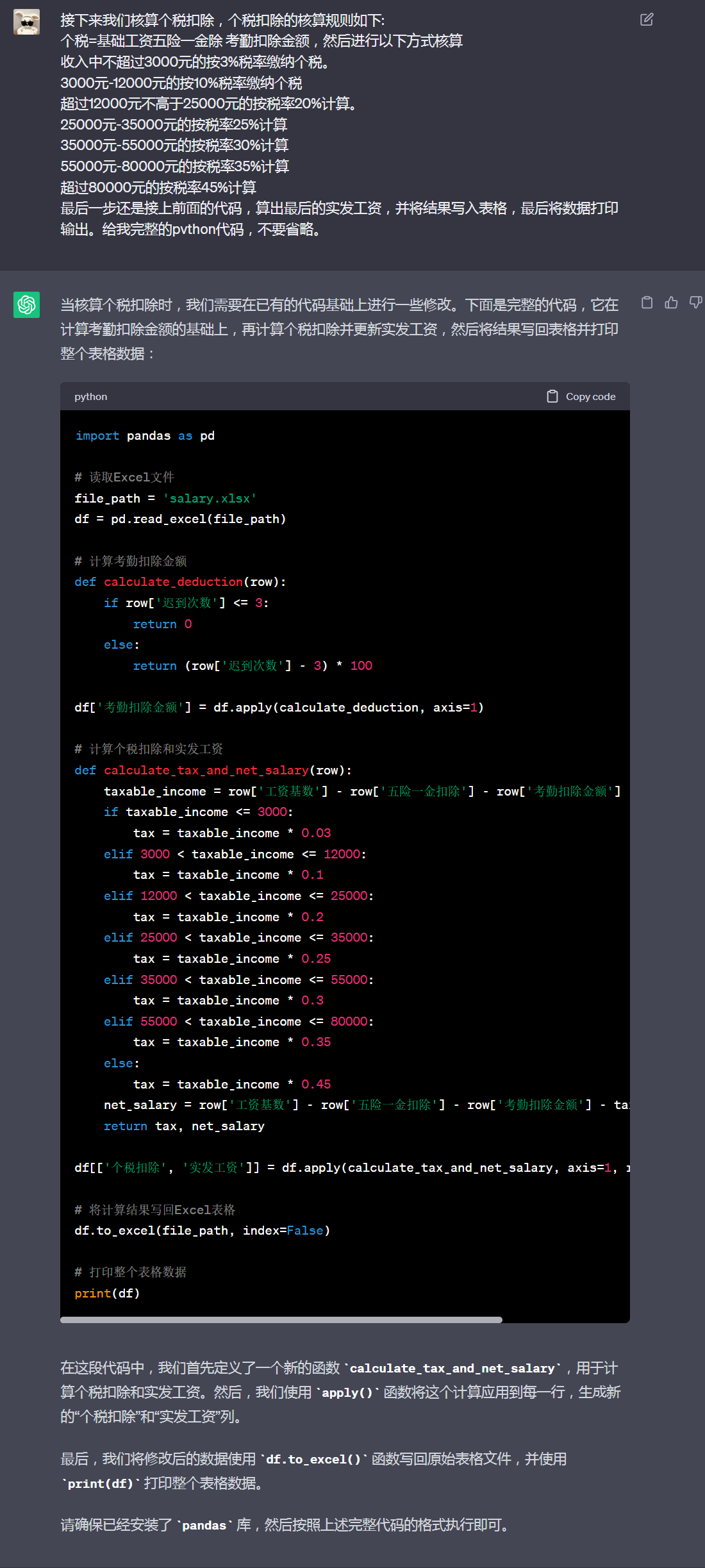 可以看到,它已经将考勤扣除金额计算出来了,现在还差个税扣除和实发工资,我们继续“念咒”。