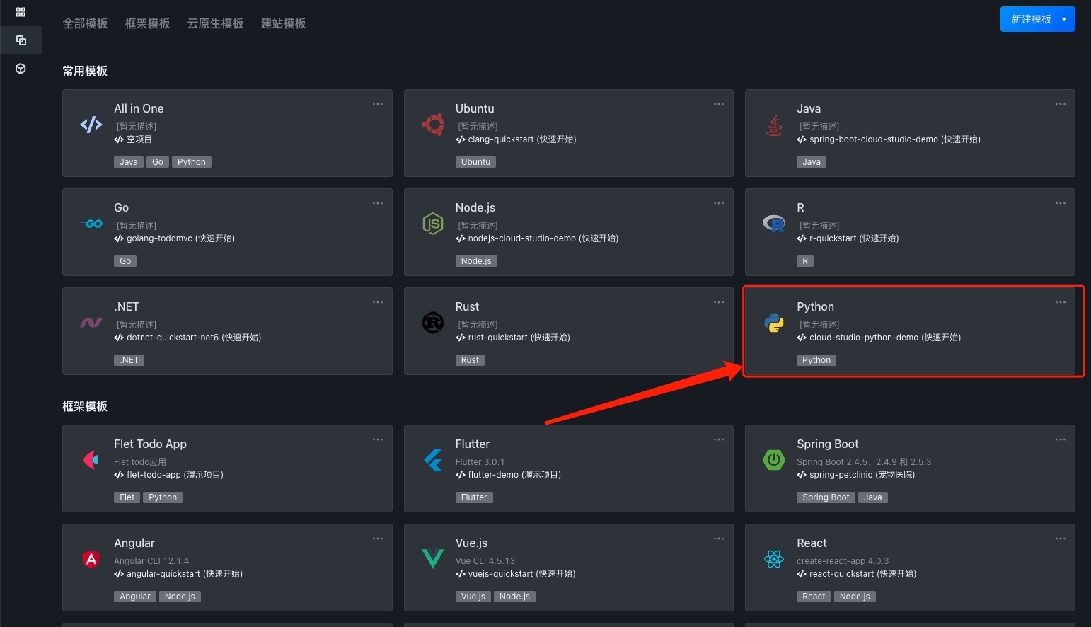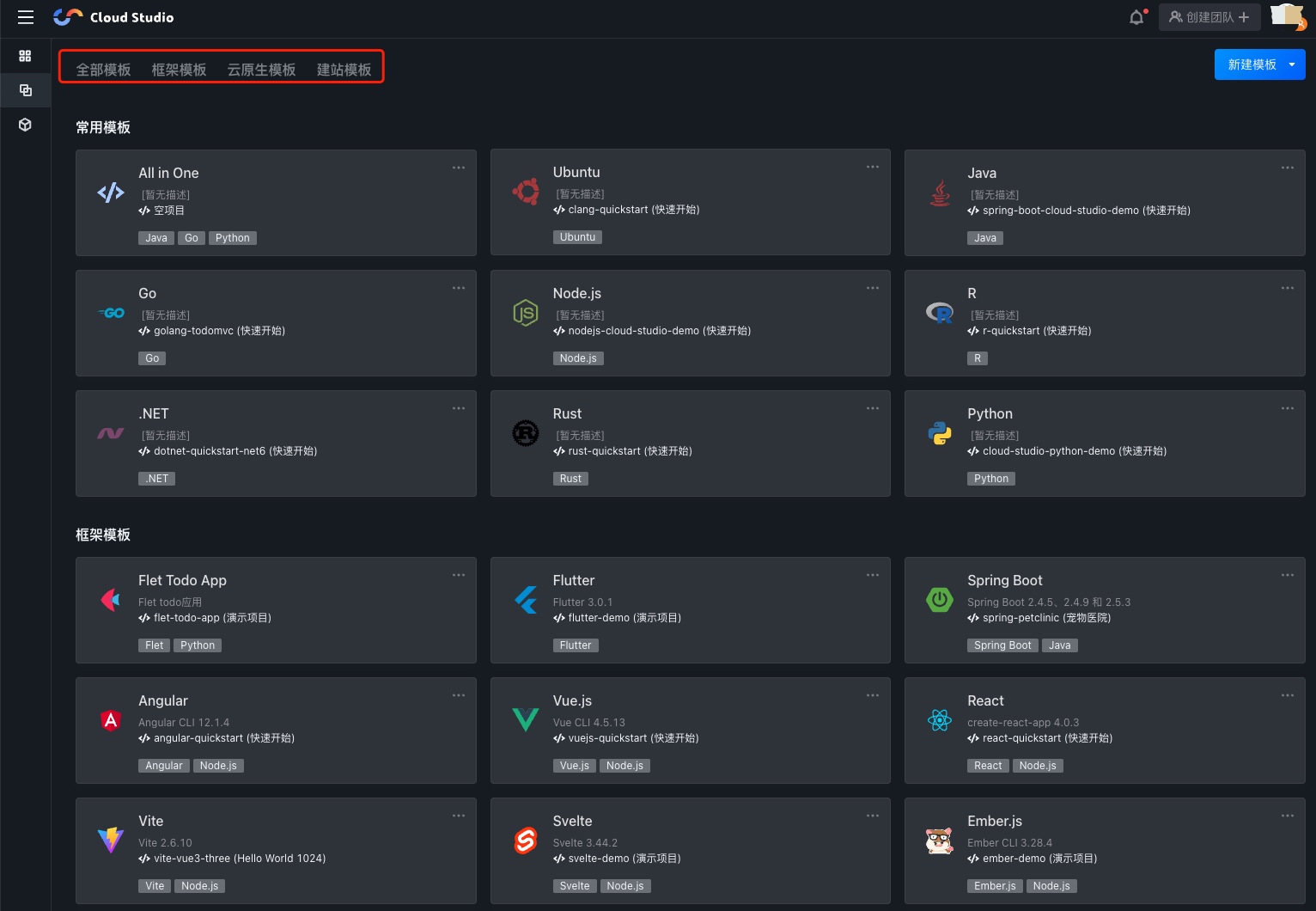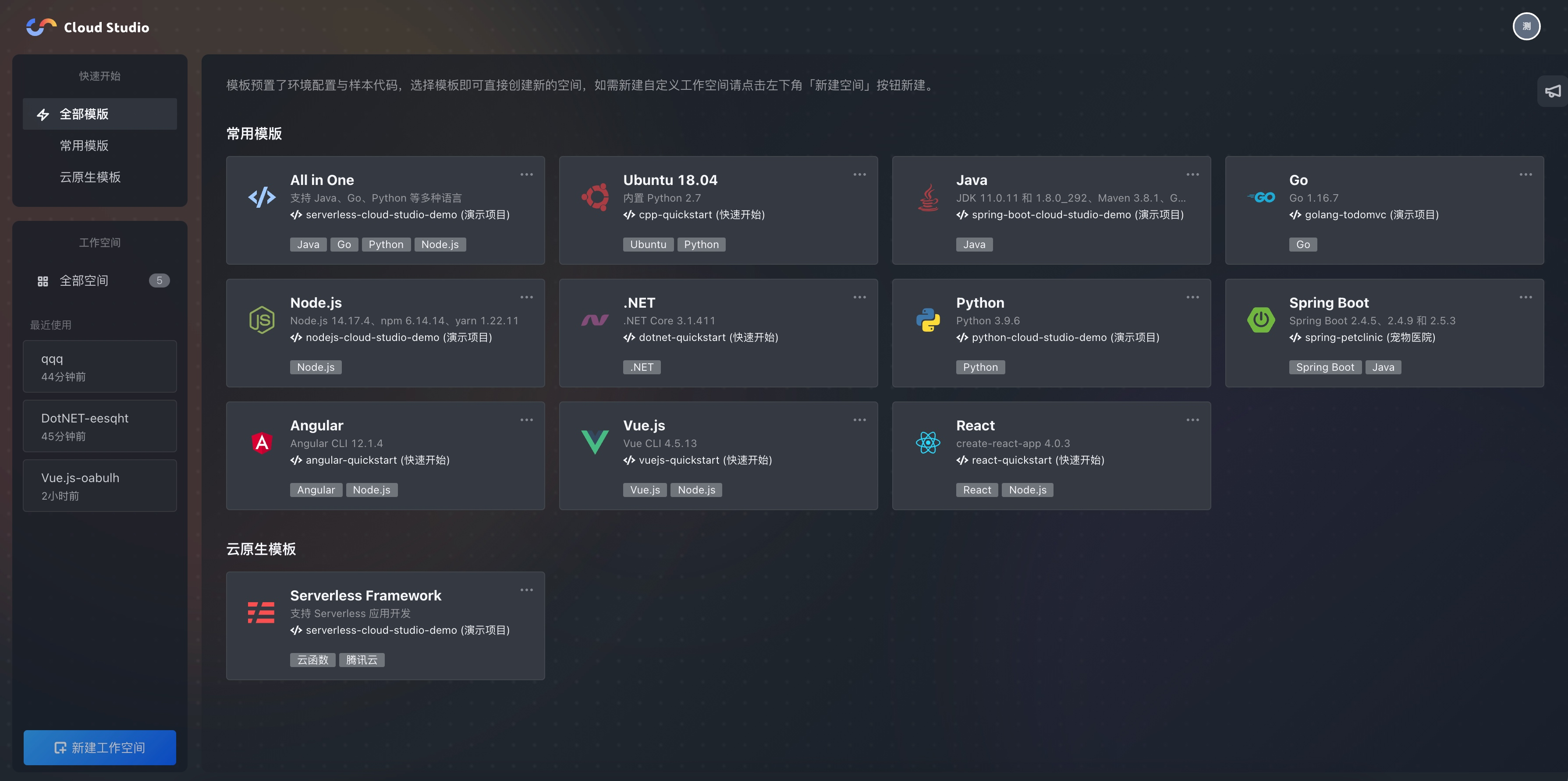 注册好之后登录即可,接下来我们回到 Cloud Studio 进入了控制台,这里有非常多的模版供我们使用。