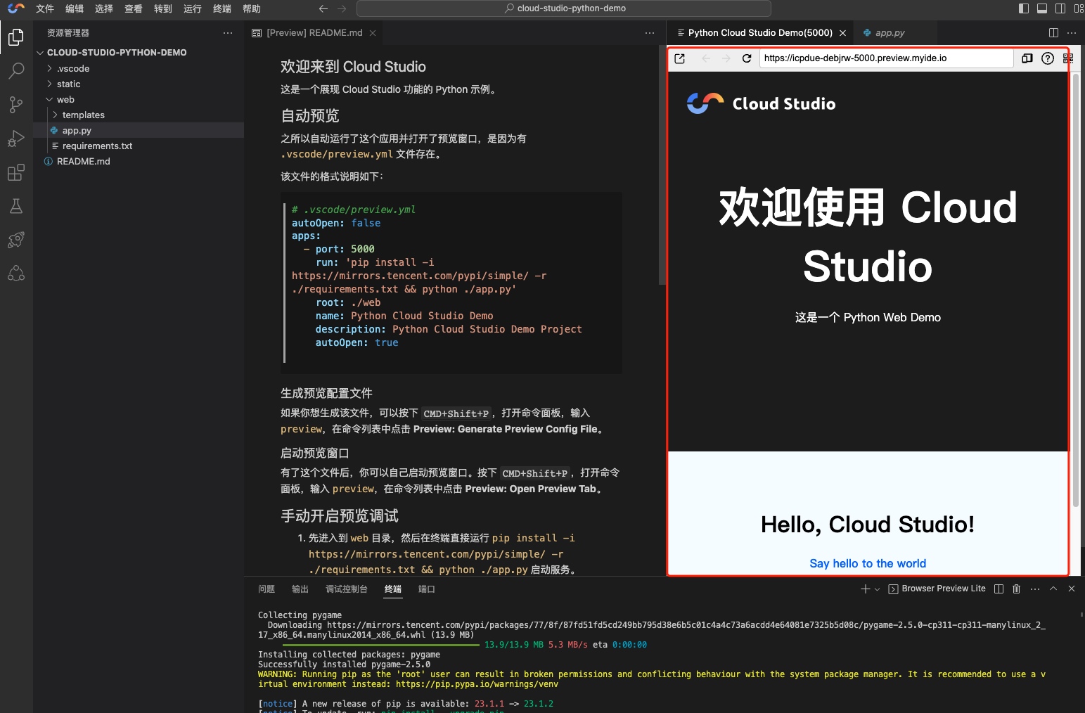 Cloud Studio 是基于浏览器的集成式开发环境(IDE),为开发者提供了一个永不间断的云端工作站。用户在使用 Cloud Studio 时无需安装,随时随地打开浏览器就能在线编程。
