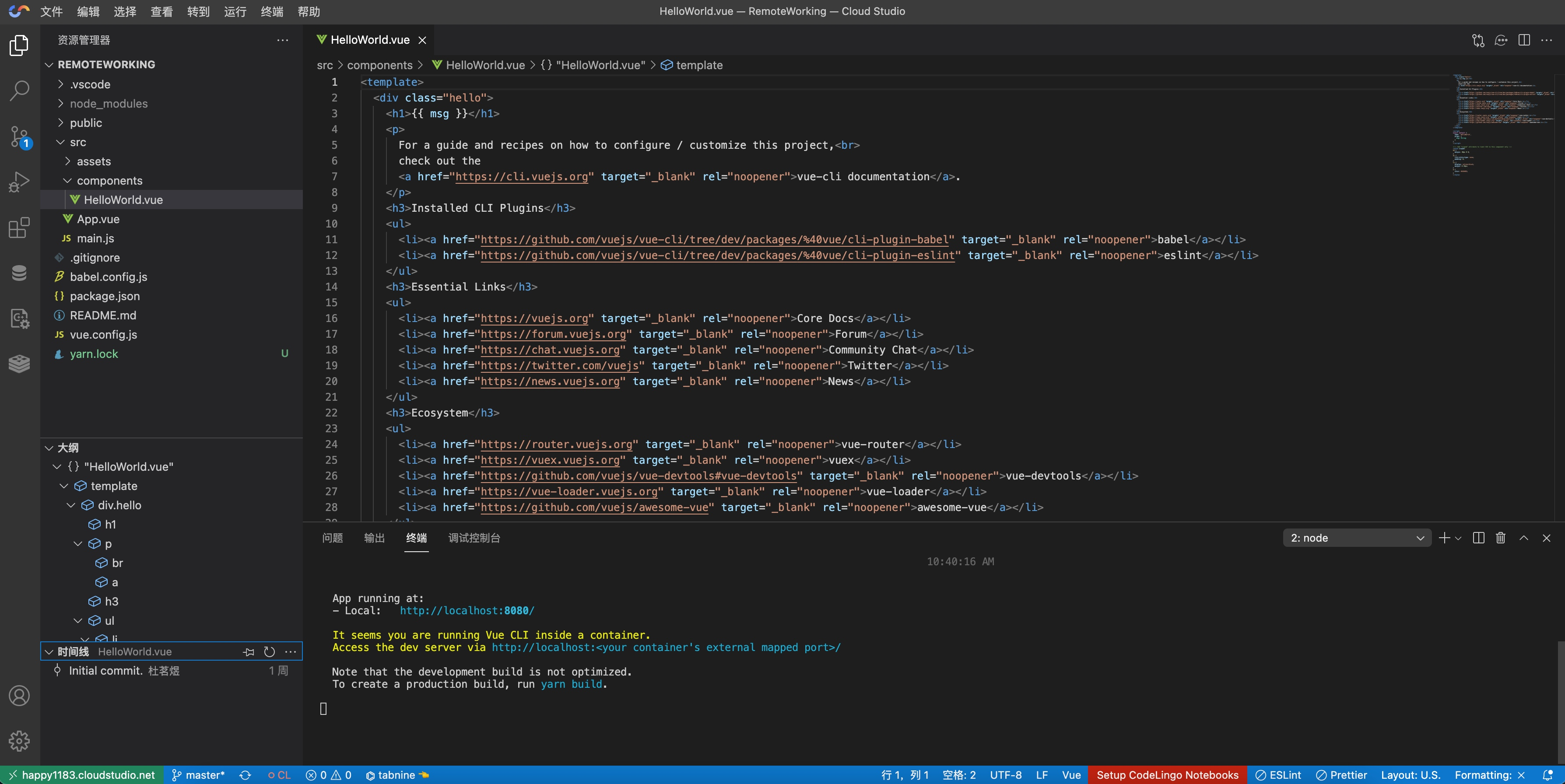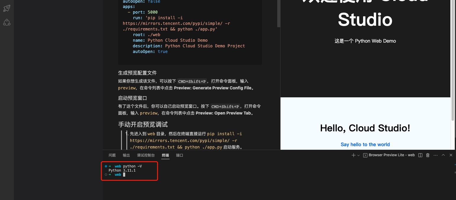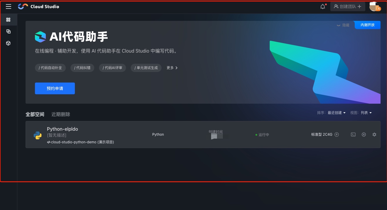 同时 Cloud Studio 也对所有新老用户考虑每月赠送 3000 分钟的工作空间免费时长。这里上手非常简单操作界面跟我们使用的 VS Code 操作界面类似。