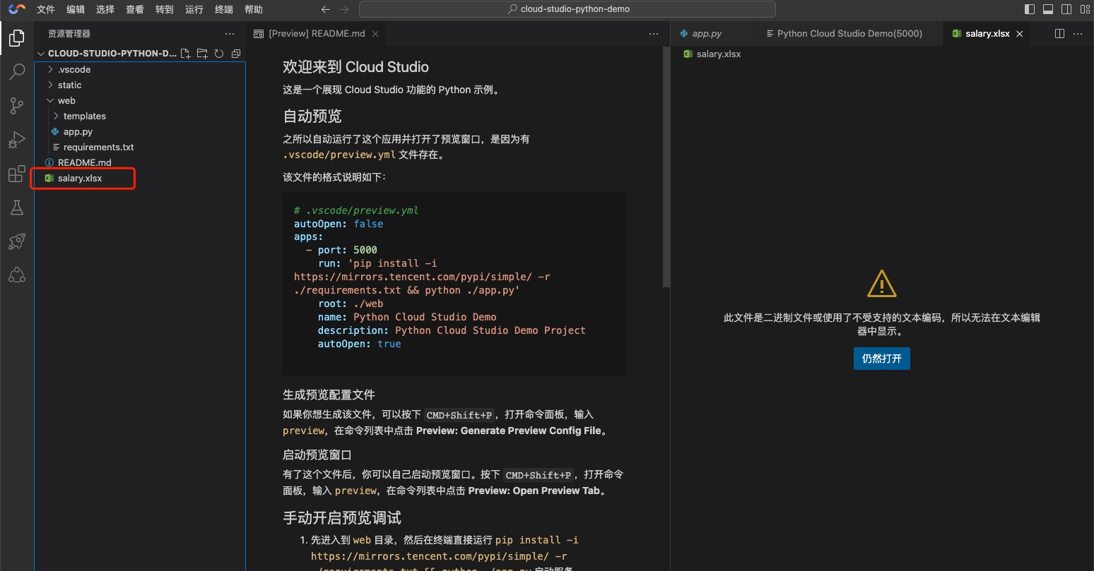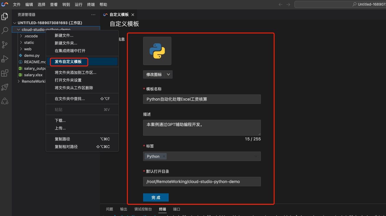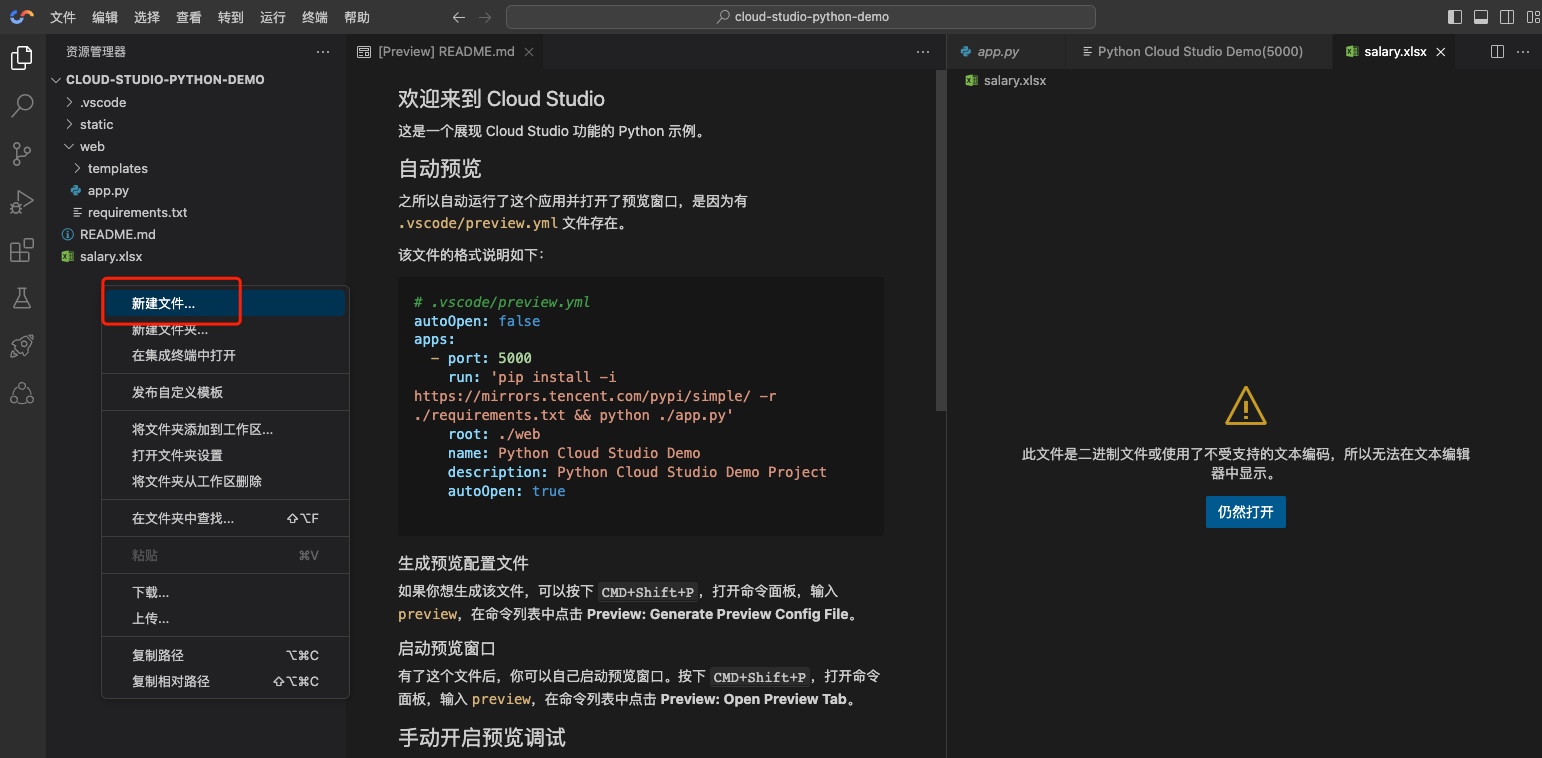 成功之后,我们在Cloud Studio中创建我们准备开始编写代码的文件。例如我叫demo.py