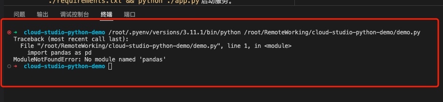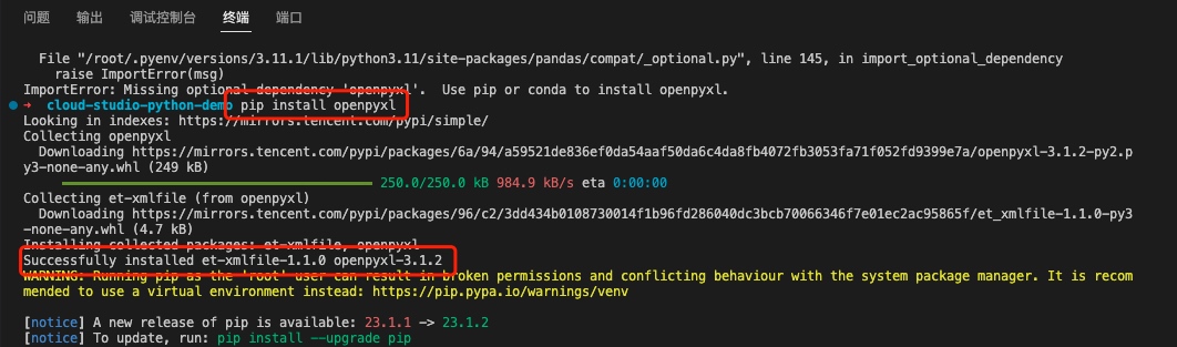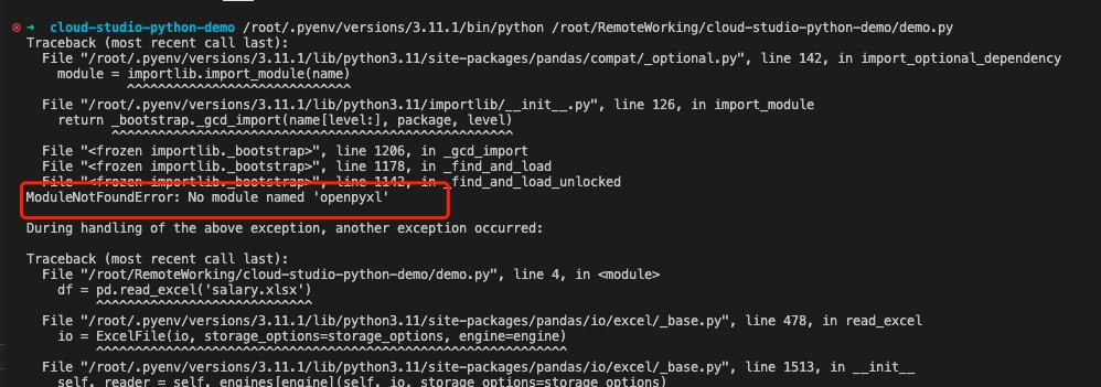 接下来再次运行 demo.py ,这次又报错了,因为 pandas 库的有些函数是依于 openpyxl 的,看来这个默认环境中也没有安装,我们继续安装一下。