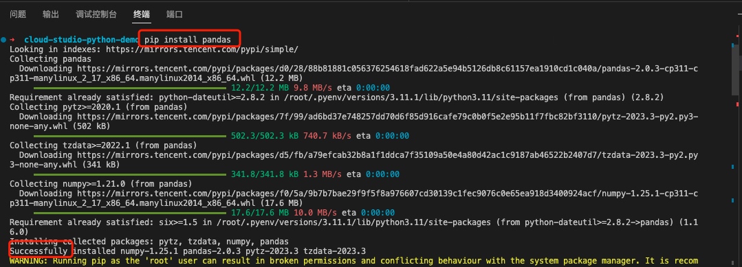 粘贴并运行后,发现默认的环境中没有pandas库,OK!我们安装一下。如果下面出现 Successfully 则说明安装成功。