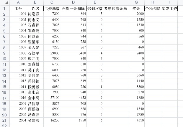由于实验关系,我们来一个比较简单的工资核算的例子(不去测算五险一金) 请运用财务部门提供的数据(salary.xlsx),根据表格中的数据核算出最终每个人的实发工资。