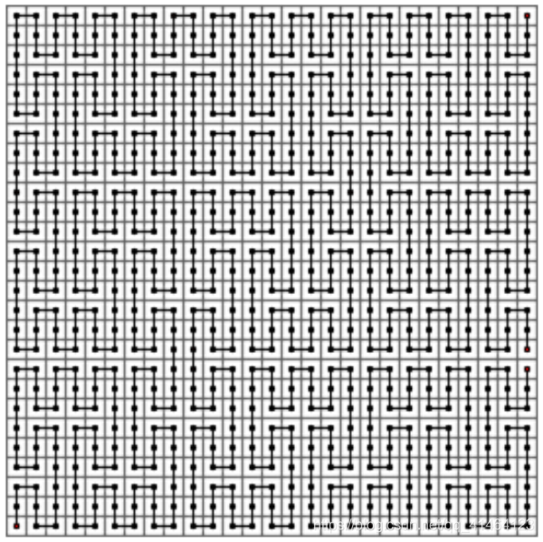下图给出了皮亚诺曲线的 2 阶情形,它是经过一个 3 2 × 3 2 的方格中的每一 个格子的一条曲线。它是将 1 阶曲线的每个方格由 1 阶曲线替换而成。