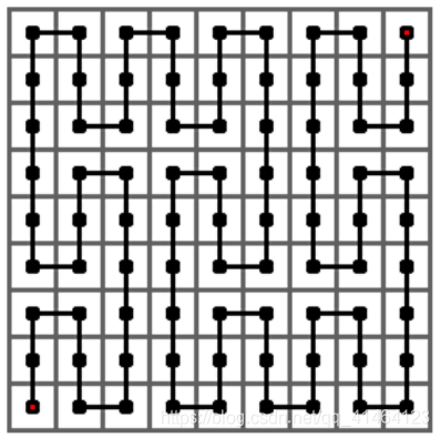下图给出了皮亚诺曲线的 3 阶情形,它是经过一个 3 3 × 3 3 的方格中的每一 个格子的一条曲线。它是将 2 阶曲线的每个方格由 1 阶曲线替换而成。