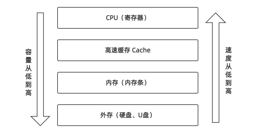 主存容量大、速度慢,高速缓存(Cache)容量小、速度快。