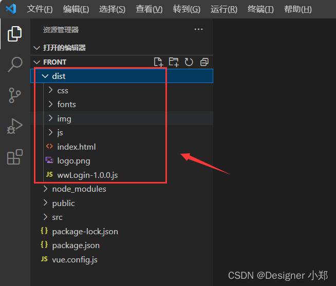 可以发现在项目根目录多了个 dist 文件夹,如下图所示,这里面就是存放了 Vue 项目的待部署文件。
