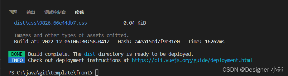 接着使用 npm run build 命令,生成编译文件,编译成功后如下图所示。