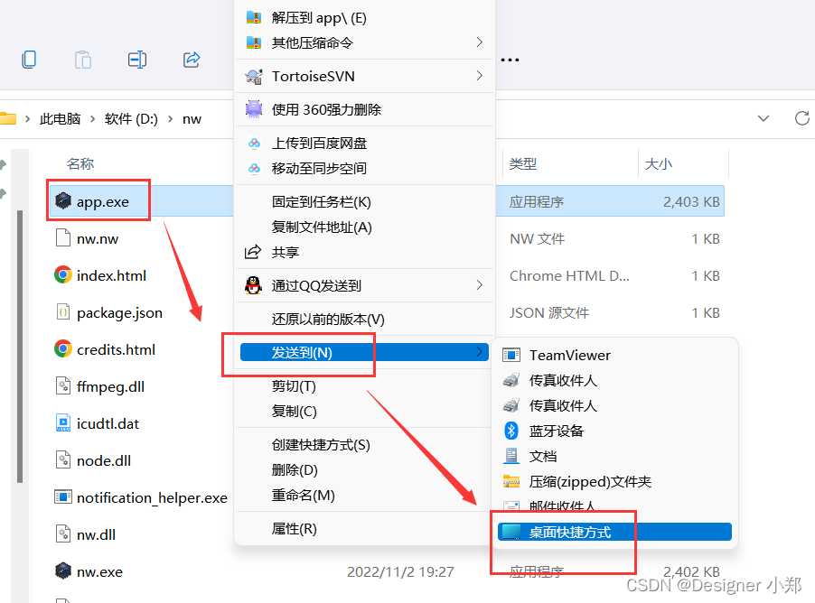 右键刚刚生成的 app.exe 文件,将快捷方式发送到桌面,操作过程如下图所示。
