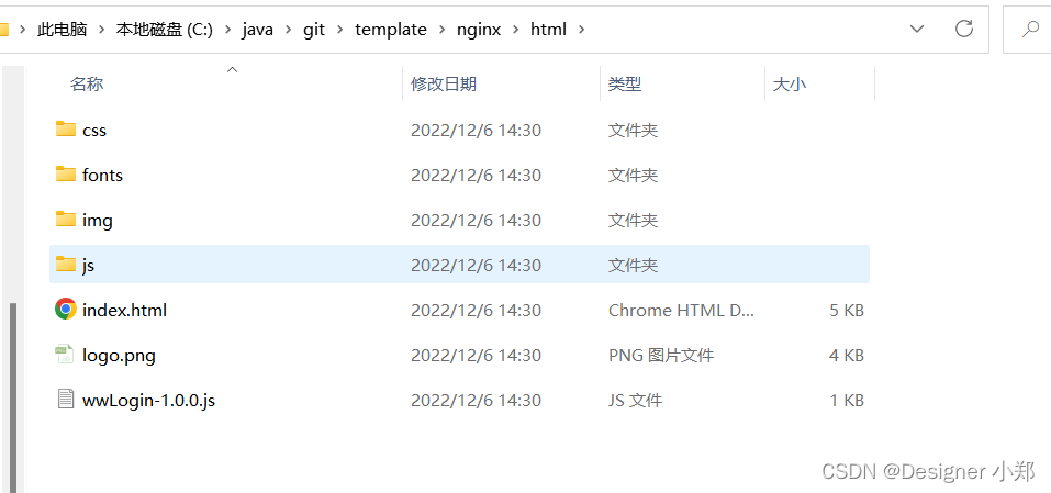 }接着将 2.2.2 步骤生成的 dist 文件夹内容复制到 nginx 的 html 目录下,如下图所示。